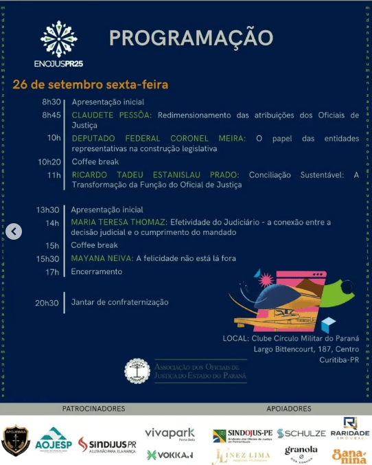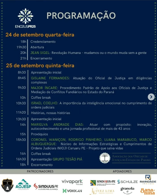 Serão três dias intensos em Curitiba, com encontros, debates e momentos que vão muito além das palestras. Cada horário foi pensado com cuidado para que você viva o ENOJUS de forma única, conectado à nossa realidade e às transformações que queremos para o futuro.