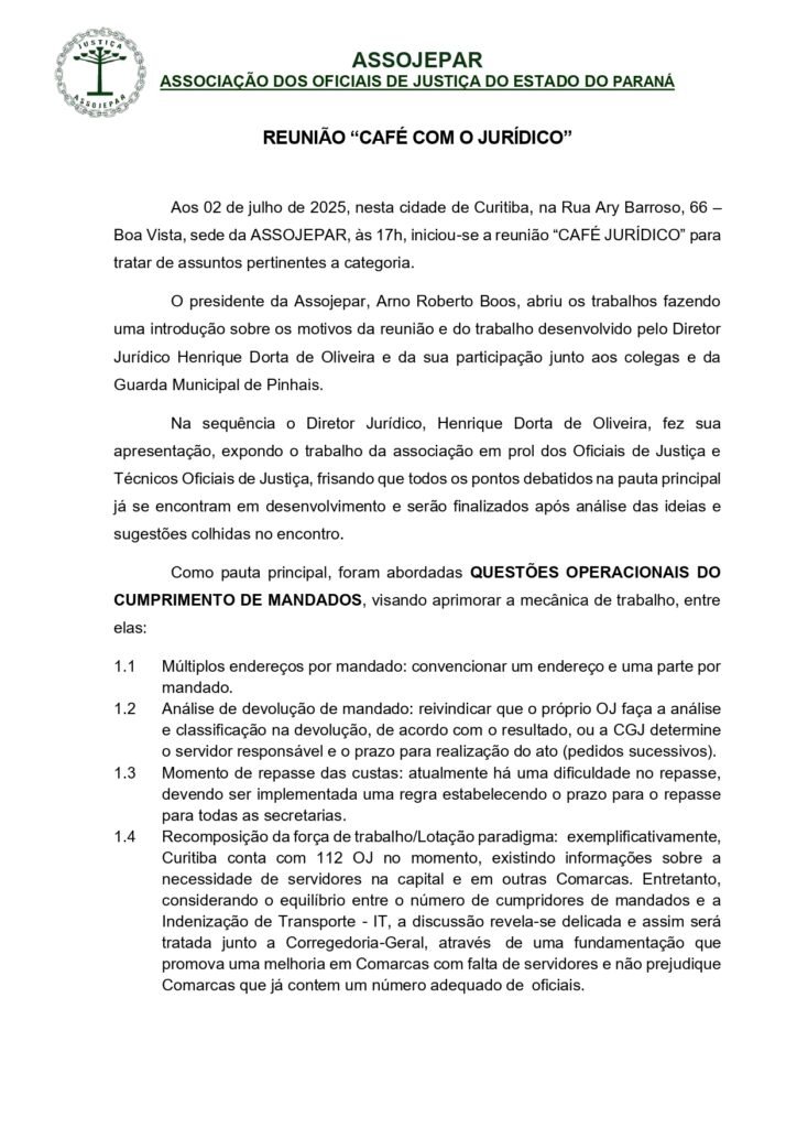 Reunião de diretoria da ASSOJEPAR trata de temas administrativos e institucionais